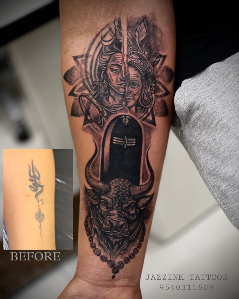 Shiva-Themed Cover-Up – From Minimal Ink to Divine Presence.