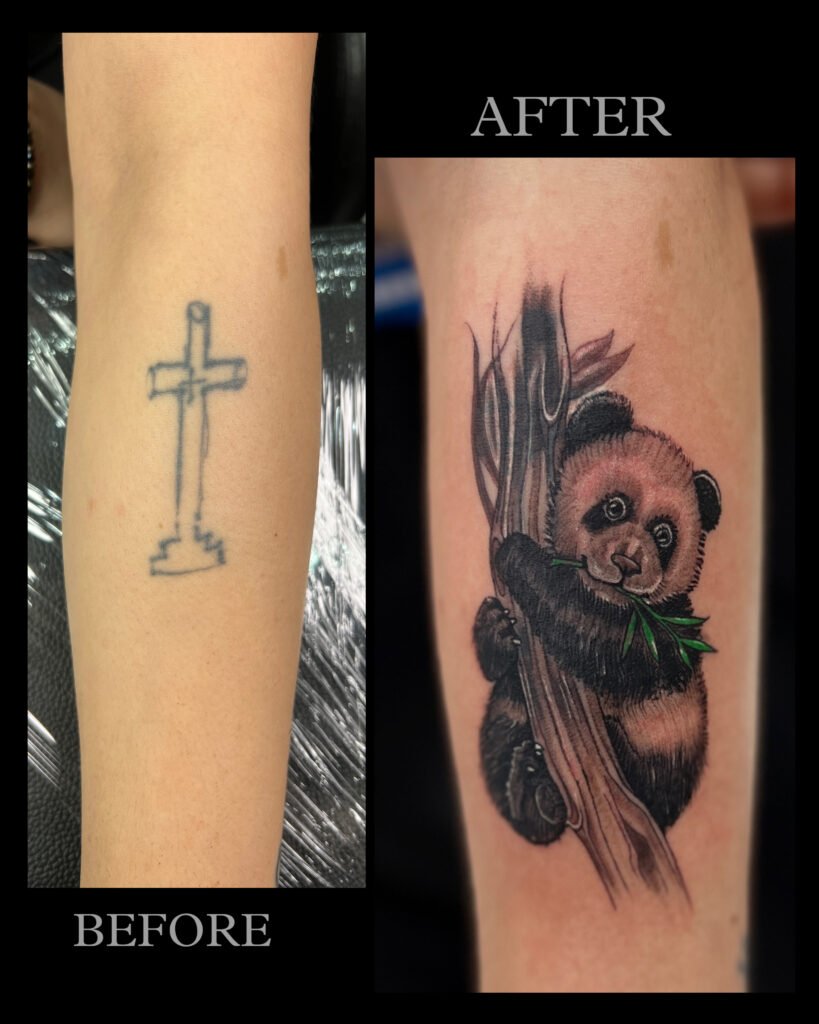 Forearm Cover-Up – From a Simple Cross to a Lively Panda Tattoo.