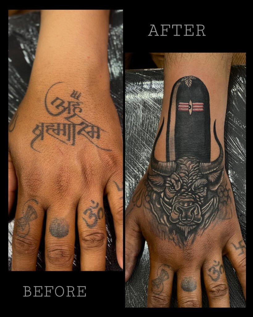 An old script tattoo on the hand is seamlessly covered with a bold, intense depiction of a Shiva Lingam accompanied by Nandi, the sacred bull.