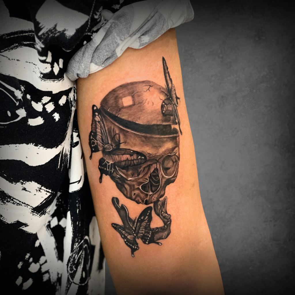 A skull tattoo isn’t merely dark — it represents truth, acceptance, and the cycle of life. Combined with butterflies, the design becomes a symbol of transformation and new beginnings. Symbolic meanings include: The skull — awareness of life’s impermanence Butterflies — hope, change, and spiritual rebirth Cracks, textures, and shadows — realism and depth Subtle surreal elements that add mystery This tattoo reflects a deeper, introspective journey — ideal for those who embrace growth through life’s challenges.